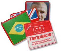 Ob Fußball Welt- oder Europameisterschaften, Olympiaden oder Kulturveranstaltungen – fanplace® ist das perfekte Give-away für die Zuschauer. Die transparente Rückseite ermöglicht die individuelle und maßgeschneiderte Gestaltung durch Inlays. Der Clou: Sie schaffen zusätzliche Werbefläche! Ihre Kunden sind Ihre Werbeträger und Sie profitieren von einer noch stärkeren positiven Emotionalisierung.